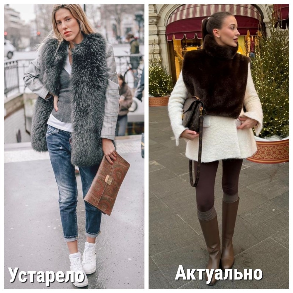 Объёмные меховые жилеты, бывшие на пике популярности несколько лет назад, окончательно перешли в разряд антитрендов. Их место заняли более элегантные и компактные аксессуары, такие как меховые манишки или горжетки, которые легче интегрировать в современный образ.